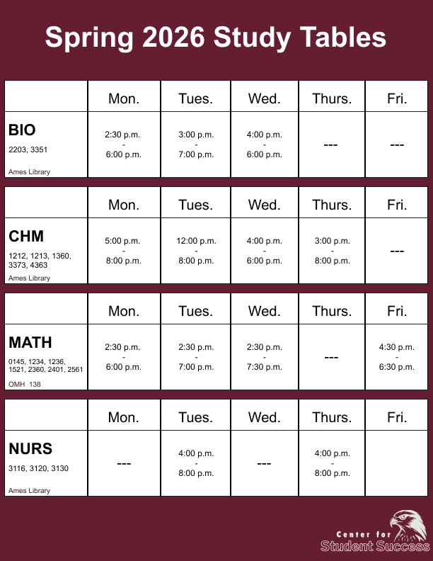 Our incredible peer-tutors are here to answer questions about class content and recommend effective study strategies. Winter Study Tables will begin March 30th and run through Friday, May 29th. Biology, Chemistry, and Nursing Study Tables are located on the third floor of Ames Library. Math Study Tables are held in Otto Miller Hall Rm 138.