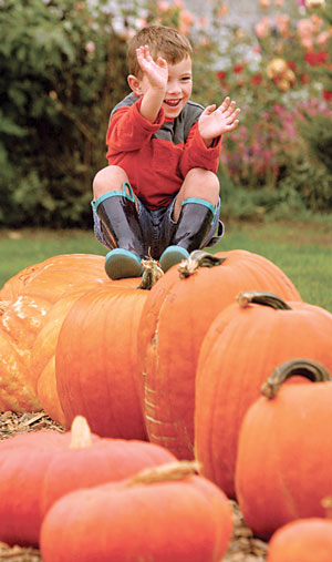 Leave it to a 4-year-old to discover that pumpkins — especially some of The Farm’s largest varieties seen here — make great chairs.