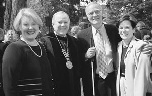 ![]() From left: Sharon and Philip Eaton, and David and Helene Winter. At Ivy Cutting on June 8, the day before Commencement, a bagpiper and student drummers led the procession of faculty and graduates into the Loop, where hundreds of family members and friends witnessed the symbolic "cutting free" of each graduate to a new life of service. Prior to Ivy Cutting, the first-ever Graduate Hooding Ceremony was conducted in Martin Square. Three students who received their master of education degrees became the first SPU graduates to complete all or most of their coursework online through an arrangement with Western Governors University. In a gesture of mutual esteem, sister schools Seattle Pacific University and Westmont College in Santa Barbara, California, exchanged Commencement speakers this year. SPU President Philip Eaton delivered the Commencement address for Westmont on May 5, and Westmont President David Winter spoke at SPU's Commencement on June 9. Both men, brothers-in-law by marriage, are passionate advocates of Christian higher education. Winter has recently concluded his 25th and final year at the helm of Westmont. "I was deeply honored to speak at Dr. Winter's last Commencement as president," says Eaton. "Westmont is a fine institution, and that is due in no small part to David's oustanding leadership." Of the 861 students eligible for degrees, 676 received baccalaureate degrees and 185 received master's or doctoral degrees.