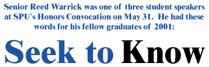 Anyone who talks with Reed Warrick for a minute knows that he is serious about his faith. Warrick, 22, from Lake Forest Park, Washington, graduated in June with a bachelor of arts degree in psychology. He decided on that major because, as he says, understanding people is basic to success in a number of life pursuits. One of these life pursuits, Warrick believes, is experiencing God in profound ways, and another is somehow changing the world for good. "We long to leave a legacy, to know beyond a doubt that our lives matter," says Warrick. Being a dorm resident for four years and a mentor to younger students taught him that humans everywhere — even in a Christian university < are "starving for significance." For up-and-coming SPU students, Warrick leaves this bit of advice: "Befriend your professors! Utilize office hours. Establish mentors. Stretch yourself beyond classroom instruction — seek wisdom and life lessons." | |||