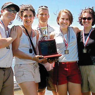 Seniors Kimberly Tschetter (second from left) and Trisha Sawatsky (second from right) won the Western International Rowing Association Championship in Folsom, California, en route to Dad Vail. They are pictured here after the event with (left to right) Assistant Coach Josh Adam, Head Coach Keith Jefferson and Assistant Coach Jessie Pennington.