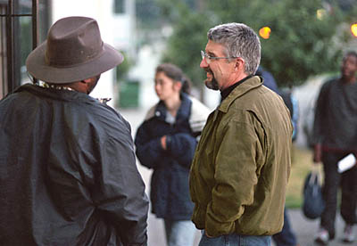 Al talks with Reynolds outside Operation Nightwatch before dinner is served. “Lots of these guys have social and job skills,” says Reynolds. “They’re just cycling through. Some are families who are in crisis, or they’ve just moved to the area, looking for a place to live.”