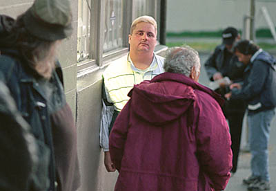 Tonight 121 people show up, nine fewer than average. No families are here, although three families came the night before. Sometimes, especially in the cold winter months when shelter space is at a premium, Reynolds must turn away dozens of people. Priority is given to women, men over age 50, and families with children. Once inside, they can watch TV, while away some hours, and get a pass for shelter for the night.