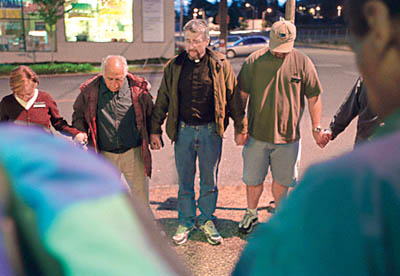 Bruce, an alcoholic, talks with Reynolds at a bar in Belltown. A prostitute soon joins the conversation. Reynolds goes onto the streets of Seattle carrying out what he calls “a ministry of presence.” He and 10 other chaplains connected with Operation Nightwatch spend time each week “visiting bars, hanging out, not giving out tracts, just being available,” Reynolds says.
