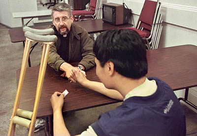 Sun Juon, a Korean man, had polio when he was young, so he walks with crutches. With the buzz of the TV in the background, he’s just about the last one in the place. Reynolds sits across from him: “Do you have a place to stay tonight? We could get you a place to stay, if you’d like. It’s no problem. Here’s a pass. This is for a shelter across town. Would you like a ride over there? I could drive you. Are you sure you want to take the bus? Because I’ve got my car right out here. I can take you there. It’s no big deal.” After a few more minutes of gentle argument, they go outside together, and Sun Juon gets into Reynolds’ car.