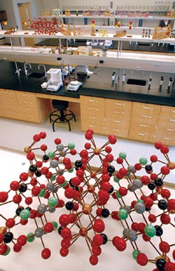 Molecular models, like the one shown in this chemistry lab, help student better visualize the shapes of molecues, which occupy three-dimensional space.