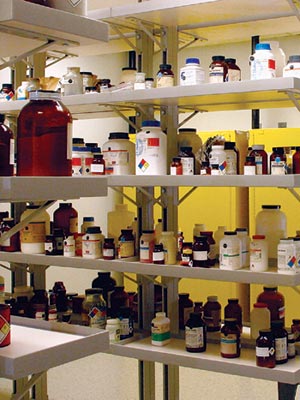 A well-planned chemical storage area provides efficient, space-saving organization of toxic and sensitive chemicals.
