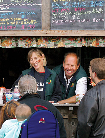 Ben and Carol greet guests visiting the snack stand, where hot chocolate, apple cider and homemade pies are top sellers.