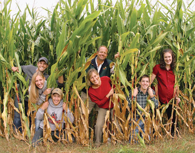 As far as the Krauses are concerned, farm life is a family affair. Here (from left to right), Nate, Beth, Curt, Ben, Carol, Todd and Kelley Krause pose for a playful moment in the corn field. A few days after the photo was taken, Kelley Krause gave birth to the first Krause grandchild, Tucker.