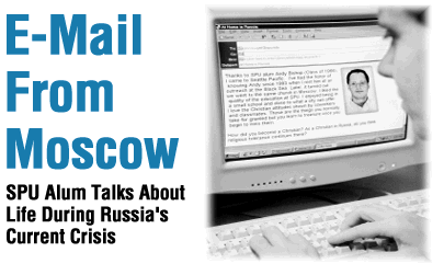 "Russia on the edge of the abyss," read a recent headline in the Seattle Times. For most Russians, wrote Times contributor Lara Iglitzin, "this is a familiar, if stomach-churning crisis: an economic downturn of dizzying speed that is accompanied by political paralysis . . ." So what is it like to live and work in Russia during such seemingly desperate times? Thanks to Seattle Pacific University alumnus Andrey Ivanov and e-mail technology, Response offers a firsthand account of the reality behind the headlines. Response writer Connie McDougall "talked" with Ivanov via e-mail about conditions in Russia's capital. A native of Russia and a 1997 SPU graduate in business administration, Ivanov lives in Moscow and works for the American company, Arthur Andersen Worldwide.