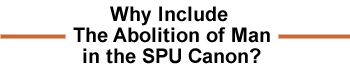 The tendency to place morality and religion on the right-hand side of the above list is no small matter. It is a fundamental feature of the current philosophical atmosphere, part of the intellectual "air" that we all breathe. Probably we have all been in a discussion of a religious or moral issue that ended with someone saying (in effect), "Look, there are no facts in this area, no scientific evidence is available. You feel one way; I feel another. And that's all there is to it. There is no objective truth about religion and morality." The Abolition of Man provides an insightful discussion of certain contemporary assumptions about morality, including the assumption that morality is just a matter of subjective feeling. The book is a profound reflection on the foundations of morality from a Christian point of view, and as such it not only merits inclusion in the SPU Canon, but is also a must-read book for every thoughtful Christian. | |||