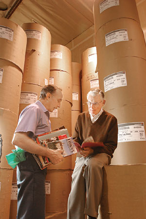 At Valco Graphics in Seattle, Walker pauses in from of large spools of paper to review the latest publications coming off the printing press.