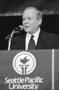 In his introductory remarks at the Breakfast, President Philip Eaton said, "Let's show our younger generation that we can grow up and have a talk about things that really matter." "We look for speakers who are leaders, opinion-shapers, people of stature who have something to say about the issues of our day," says Seattle Pacific President Philip Eaton. This strategy has been an effective way to communicate with an off-campus and often-secular audience, says David Justin Ross, CEO of RAF Technology, and new member of the SPU School of Business and Economics Executive Advisory Council. "As a businessman who is also a Christian, it's important for me to see a high-quality Christian organization like SPU actively engage the general community." Precisely the point, notes President Eaton. "This is not a fund-raising event. Our purpose with the breakfast is to engage the culture, reflect on the issues, and build toward a better community." It's an effort that is well-received by hundreds of people every year, including Frederick Weiss, president of Weiss-Jenkins Development Company. "We've been treated to messages of common sense and wisdom on a variety of topics," he says. "Sometimes it's a bit controversial, but it's always thought-provoking." One benefit of the Breakfast for SPU has been the establishment of positive, lasting relationships with guest speakers. According to Bennett, "The event at Seattle Pacific was perhaps the best event of its kind that I have ever attended." | |||