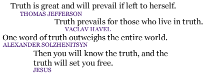 Menchu told this story all over Europe. In huge crowds, the spotlight would fall on her, and people would break out spontaneously into tears, and the emotion was profound. Eventually, as I said, it led to a Nobel Peace Prize. But then other parts of the story kept coming out. People — such as an anthropology professor — began to realize that she should have got the Nobel Prize for fiction, not peace, because much of her story had been fabricated. Her parents and brother had been killed by the secret police — but not in that way. In fact, no one had been burnt alive in the public square in the way she described. It was largely a fabrication. But when people pointed that out, others said, "How outrageous to coerce on her our Western views of journalistic veracity. She had in mind the larger truth of her victimized people. And in the name of that larger truth, it was thoroughly proper to concoct stories like this." You can see examples of this on the left, in the center, and on the right. Including, say, Christian fund-raising letters. As you know, many of the stories told by rescue missions — as they were raking in the shekels — were actually concocted stories, or stories put together with different parts so that they were far more emotionally powerful. Now where are we today in this world of spin and fabrication? In our Western culture — and you can see this from the Bible and the classical Greeks on down — there has been a stress on truth and character, as in the biblical idea of being who we are when nobody sees us except God. So there's a link between character and truth because God sees the heart, not just the appearances. So for most of the West, the word of Jesus has been decisive. Who are those people who act in public in ways which they are not in private? They are actors. And the Greek word is "hypocrite." Now there have been other voices. Machiavelli, for example. If you have to portray yourself as something you aren't — fine. Because all that matters at the bottom line is survival. By and large, those have been the maverick voices, but in the last hundred years in America, they are increasingly the dominant voices. Mark Twain, who created himself in many ways, said, "In America, the secret of success is sincerity. If you can fake that, you've got it made." Groucho Marx said, "Hey, these are my principles. And if you don't like them, I've got others." And you can see we move down to today. We are in the world of public relations, and spin doctoring, and impression management, and plastic surgery. Anything but character. Anything but truth. Take, for instance, the impeachment hearings. As in the O.J. Simpson trial. Very simple tactic in the postmodern world. It's not truth that counts. Whoever has the dream-team lawyers, whoever has the PR consultants, whoever has the attack dog friends - wins. The challenge then, as the president said, is to win. Why? There is no truth. There is no character. Everything is a matter of impression, and image, and power.
