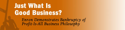 It is still too early to draw a complete set of lessons from the recent debacle at Enron, the Houston energy giant, but we can probably make a few preliminary assessments. First, it seems likely that some laws were broken. In and of itself, this is not terribly remarkable. A combination of greed and opportunity will often result in criminal behavior. What is more noteworthy, however, is how few laws will in the end likely turn out to have been broken. In many instances, it appears that Enron was merely operating in accordance with some of the more conventional notions of good business. In recent decades, popular business philosophy has demanded that corporations be managed with a single end in mind. The sole job of corporate management indeed their fiduciary duty is to maximize the return on the shareholders' investment. While this duty does not require corporate officers to break the law, it does require, where necessary, pushing to the very edge of legal limits. By these standards, many of the actions taken by Enron's management were laudable. They took full advantage of the accounting and legal loopholes that existed. Where loopholes couldn't be found, political muscle was used to create them. Choices made in gray areas were consistently and aggressively pro-Enron. But for the stunning collapse of the company and the human wreckage it has left behind, Enron might well have been used by many as a case study of good business. In our view, however, Enron marks another crack in the edifice of this "shareholder-value-is-king" approach to defining "good business." What, then, is a "good" business? This question rests at the very heart of Seattle Pacific University's School of Business and Economics. Likewise, it has significant practical implications for Christians in the business world. One way to examine the question is by reference to a not-too-far-fetched human metaphor. From a legal perspective, a corporate entity is often characterized as a "person," with an independent existence and a capacity to make contracts, sue and be sued. If a corporation is held to legal standards applicable to a natural person, why then shouldn't it be held to moral standards as well? From this vantage point, we might ask what are the characteristics of a good person? What makes for a good colleague? A good neighbor? At SPU we have defined this essential goodness as the intersection of two core values. According to our mission statement, we seek to graduate students of competence and character. Both values are important.