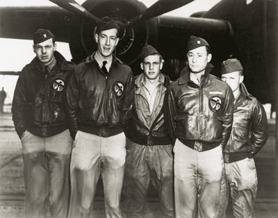 The crew of #16 (from left): George Barr (navigator), William Farrow (pilot), Harold Spatz (engineer gunner), Robert Hite (copilot) and Jacob DeShazer (bombardier).