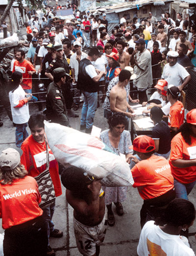 In January 1999, World Vision workers met with community leaders to establish a system for distributing relief packets to victims of the 6.2 earthquake that leveled Armenia, Colombia.