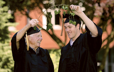 Sheldon Arnett and grandson Jeremy Johnson are both members of the Class of 2003. Nearly 60 years apart in age, they happily shared in Ivy Cutting, an SPU graduation rite as old as Arnett.