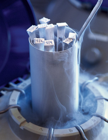In this photo, frozen human embryos are removed from liquid nitrogen storage. Embryos currently being used for research are those, such as the ones pictured here, that are left over from in vitro fertilization procedures.
