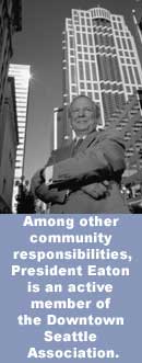 It was fitting then that the John Templeton Foundation named Eaton one of 50 U.S. college and university presidents who "are setting the standard in higher education for what a leader can do to . . . prepare students for lives of personal and civic responsibility." At the same time, SPU was named to Templeton's list of 100 "Colleges That Encourage Character Development," and four of the University's programs -- the Common Curriculum, the Center for Relationship Development, student leadership and Christian formation -- were cited as "exemplary" in terms of character development. Only four other universities nationally were commended in as many different categories. The recognition of Eaton's contribution to character-building comes after four years as president of Seattle Pacific, during which time he has seized every opportunity to communicate the University's vision. Most recently, in speeches to the Seattle and Bellevue Rotary clubs, he spoke about the requirements of leadership in the 21st century, including "clarity of moral vision." "I don't think we can afford much more confusion on these matters," he said to 800 businesspeople. "Truthfulness, integrity and honesty matter. Character matters greatly. . . . We say at SPU that we are preparing graduates of competence and character. We say we are providing for them the resources of wisdom and discernment, that we are giving them the model of grace-filled community. These are big aspirations -- but absolutely essential for the future health of this community and our world." The message has had an impact. Bruce Walker, CEO of Valco Graphics in Seattle, joined a standing ovation for Eaton's Rotary speech. "The whole basis of our society is trust and honesty, and that's why SPU's vision is critically important. Phil believes very strongly that character development can be taught. It's not something you either have or don't have. It's something that can and should be developed. Believe me, he is held in very high regard." One of the University's most prominent forums for exploring character in public life is its annual Greater Seattle Community Breakfast. Respected thinkers -- including Pulitzer Prize-winning columnist George Will, international journalist David Aikman and, in May 2000, former Senator George Mitchell -- challenge community, business and government leaders with a variety of principled ideas. Aikman, speaker at the breakfast in April 1999, says Eaton is the right man to facilitate a discussion about character. "The thing that distinguishes Phil as a character-building president is his Christian witness. He is bound to build character because of who he is. . . . A civilization doesn't prosper without being moral. Some good-hearted people say that if you have passion, that's all you need. But you have to match competence with character. They build on each other." For all the talk about character, it is Eaton's own character that speaks the loudest. Max De Pree, nationally acclaimed CEO, best-selling author of Leadership is an Art and one of Eaton's mentors, says this about SPU's chief: "The most impressive thing that Phil Eaton tries to impart to students is personal integrity. He is very much the person he projects. There is no gap between his public persona and what he is. Students appreciate that. They have an incredible nose for hypocrisy." Seattle Pacific's message, delivered with Eaton's easy, personable style, has reached across religious and cultural divides. When novelist Chaim Potok spoke on campus about the importance of values in modern life, Eaton invited local Jewish leaders into his home to meet Potok and talk about common concerns. When the ACLU took on the Washington Association of Independent Colleges and Universities (WAICU), challenging state funding to private institutions, Eaton worked hard to convey SPU's vision for Christian higher education to its most ardent detractors. "What Phil does every day is engage the culture, sometimes in ways nobody ever sees," says Vice President for University Relations Marj Johnson. "He cares genuinely about communicating Seattle Pacific's distinctives in a way that is winsome and relevant. Driving back to campus after a particularly difficult grilling from an ACLU lawyer, I told him: 'You wanted to engage the culture -- and that's what you're doing. You're helping people to understand that we're not a narrow, self-absorbed institution, but a university with something important to say to the issues of our day.''' For Eaton, "engaging the culture" is as intensely personal as it is communal. "I believe in it, not just as a slogan on paper, but as a way of moving forward with integrity and great effectiveness in the new millennium. Character comes down to the individual, to the choices we each make in daily life. I want students to understand that means living in the world with our eyes on Jesus Christ. If we do that, we can change the world." Though Seattle Pacific's message is what De Pree calls "unusual, even for a Christian college," its power is clearly evident. "I believe that President Phil Eaton sets a standard that is unparalleled here in the Pacific Northwest," says Washington Secretary of State Ralph Munro. "When we interview applicants from Seattle Pacific University, we know we have a better quality graduate on our hands. These are young people who know and understand values and character and working toward a positive future. Much of this is to the credit of President Eaton. | |||