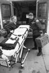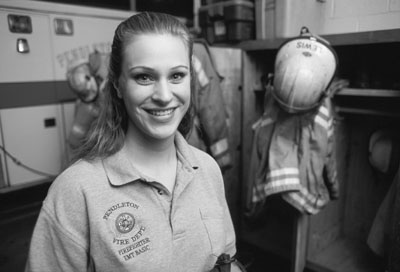 A year ago, Sarah Hardman was a guest on the syndicated Maury Povich Show, representing "Women in Male-Dominated Careers." As a student firefighter (below, right), she wrestles the same heavy gear and equipment as the seven males on her shift. On emergency medical duty (below, left), she drives an ambulance and resuscitates all ages, from infants to the elderly. Her goal? To always strive for "a good outcome."