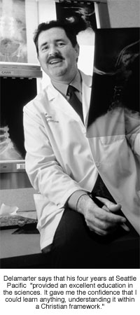 Seattle Pacific University recently named Delamarter, Class of 1977, the 2002 Alumnus of the Year. He was chosen for the University's highest honor because of his achievements as a surgeon and as the medical director of a technologically advanced clinical and research institute for the spine. "On top of that, Rick is a business leader," says Alumni Director Doug Taylor. "He's a dynamic person, an expert in more than one field, and a man with a deep and meaningful faith." SPU President Philip Eaton describes Delamarter as "one of our truly distinguished alumni. He represents what we hope for in our graduates: extraordinary professional competence as well as faith, character and wisdom. I consider him a good friend and value his partnership with Seattle Pacific and our vision. He is testimony that our vision is alive and well." "The Seattle Pacific University Alumnus of the Year award, given in recent years to such individuals as Gaylord Gunhus, the Army's chief of chaplains, and David Wong, a key developer of Prozac, makes Rick Delamarter feel a mix of pride and humility. "There's a responsibility that goes along with this award that I'm humbled by," he says. "I'm not sure I'm deserving, but I'm proud to represent Seattle Pacific. Proud, because it gave me a great start for the world I'm in now." Growing up in Pendleton, Oregon, Delamarter received an early education in health care. "My family has been in the long-term-care, nursing-home business for a while," he says. "Even when I was young, I spent a lot of time taking care of residents in long-term facilities. I got a feel for helping people out and found I enjoyed that." Delamarter not only earned All-Conference honors in football during his senior year at Pendleton High School, but also maintained a 4.0 GPA. He loved to study the sciences, especially chemistry and biology. It seemed natural, then, to double-major in chemistry and biology at Seattle Pacific, where more than 20 of his relatives had attended, including both of his parents. At SPU, Delamarter joined a pre-med club. "I believe that he was a pre-med student the day he set foot on campus," recalls Professor Emeritus Wes Lingren, one of Delamarter's chemistry instructors. "Rick was an outstanding student." Professor of Chemistry Paul Lepse also remembers Delamarter as an avid scholar. "Rick developed good diagnostic skills in identifying unknown samples in the laboratory," says Lepse. "He was not one of those students who took chemistry because he had to, but because he really liked it. I'm pleased, but not surprised, that he went on to have such a successful career in medicine." Although Delamarter recalls his days at Seattle Pacific as a period when he "pretty much focused on studies," he still had time to meet and court his future wife, Janna Racine. Graduating first in his class of 600 with another 4.0 GPA, Delamarter received the President's Citation, SPU's top academic award, for 1977. After earning his M.D. at the University of Oregon Health Sciences Center in Portland, Oregon, he went on to a surgical internship and orthopedic surgery residency at UCLA Medical Center. At this point he decided to specialize. "I was fascinated with anatomy," says Delamarter, "especially spine research." When he started, many of the techniques had been done for 30 to 40 years without solving common spine problems. "I felt spine research was an area with a lot of room for innovation." After a spine fellowship at Case Western in Cleveland, Ohio, he participated in a second spine fellowship in Paris, France, where he studied innovative techniques not yet accepted in America. From 1989 to 1999, Delamarter directed the Comprehensive Spine Center at UCLA. Nearly two years ago, he moved the entire spine program to Saint John's Health Center in Santa Monica. The facility consists of a 25-bed ward exclusively for spine patients, two operating rooms and an outpatient clinic for the treatment of spinal disorders. As both medical director and research director, Delamarter steers the groundbreaking work of the Spine Institute. "By having the Spine Institute at Saint John's," says Delamarter, "we can be a little more focused than we could be at a major university. Now under one roof we have all the components for a state-of-the-art institute, including research." Some of this research is done by Delamarter himself, who holds patents on advanced technological tools such as titanium screws that help fuse patients' injured spines. Through the years, his personal research has focused on two areas. The first is basic science research, which today consists of gene therapy and experiments with cell cultures, including adult stem cells. The second is clinical research, which includes Food and Drug Administration trials on artificial disc replacements and the perfecting of surgical techniques. Appearing occasionally on television news programs, Delamarter is a spokesperson to the public about the latest back and neck treatment breakthroughs. One of these breakthroughs, called Kyphoplasty, is a minimally invasive procedure for people with spinal compression fractures. Surgeons are now able to inflate tiny balloons to pump up a compressed spinal fracture, filling space in the vertebrae with special bone cement. Patients give the procedure rave reviews, and many are able to walk virtually pain-free within hours. In addition to his roles at the Spine Institute, Delamarter holds the position of associate clinical professor of orthopedic surgery at UCLA. Medical students often accompany him on his rounds and in surgery. And in 1991, he became chairman of the board of directors for Prestige Care, Inc., the chain of nursing homes run by the Delamarter family for four generations. Delamarter's achievements have earned him high honors, and he lectures worldwide about the treatment of spine injuries. His articles and chapters in medical journals and books number in the hundreds. But he is still learning daily.