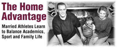 Seattle Pacific University senior Jeff McBroom knows the importance of teamwork on the court -- and at home. After practicing up to four hours a day as a starting forward for the Falcon varsity basketball team, attending classes and studying, he carves out time for his most important priority: his family. McBroom is one of six SPU student-athletes on this year's basketball, volleyball and soccer teams that balance academics, a demanding athletic career and a family. Married for three years, the 23-year-old McBroom and his wife, Karrie, found the move to SPU from Green River Junior College in 1995 took some adjustment. With the arrival of their daughter, Ashley, McBroom admits that it hasn't been easy juggling basketball, marriage and fatherhood."We were newlyweds with a baby going to a school where we didn't know anybody," he says. "It was really challenging." Until this year, McBroom was the only married man on his team and sometimes had trouble connecting with teammates whose lives seemed carefree in comparison. "I felt like they just had no clue about the life that I live," he says. That's changed this year with the marriage of senior center Chuck Carter and junior point guard Ryan Skogstad. "I wouldn't have guessed when I was a freshman that I'd be married now," admits Skogstad, who says he can see why other players might not understand his life. "They do a doubletake when I take off my ring and put it in my locker." Like McBroom, Skogstad found his transfer from Western Baptist College this fall difficult. Married in early September, he and his wife, Kelsie, had only a few weeks to get adjusted before Ryan began classes and full-time practice. "A new school, a new city, Kelsie's new job --all these changes were a stress," says Skogstad. Carter, whose wife, Kathy, is a nurse, says the biggest challenge in his marriage is keeping up with each other. "If you are just a student and married, it's still tough with classes, but being married and an athlete just squeezes that much more out of you." The Skogstads also struggle to find time together. Kelsie works full-time as a program director for Olympic Athletic Club during the day, while Ryan often has evening practices. "We try to find time together," he says. "I find little breaks for homework so the time I have free I can spend with her." Another married Falcon basketball player is Shauna Bland, a junior point guard on the women's varsity team. For Bland and her SPU-student husband, Eli,"Time is the biggest challenge because our schedules are opposite," she says. In addition to juggling schedules and time for study and work, the couples experience tensions related to budgets and finance. McBroom's main source of income is an athletic scholarship -- but that doesn't pay for everything. "Week to week we barely get by," he says. The couple relies on family for some financial support, and Karrie has put her own college education on hold to work full-time. The Blands rely on a combination of athletic and academic scholarships, work and their families to pay for school and living expenses. Faith in each other and faith in God helps the couples stay in balance. "We do devotions together every night," says Ryan. "I think that keeps Kelsie and I together and helps us realize what's important in life." Likewise, the McBrooms find support at the Solid Rock Community Church where Jeff is a worship leader. Despite all the challenges, the athletes say they wouldn't do anything differently. "I'm not worrying about who I'm going to marry and what's going to happen," says McBroom. Carter agrees, adding, "You have someone waiting for you at home that loves you as much as you love them." For these Falcon athletes, teamwork has a whole new meaning. | ||||