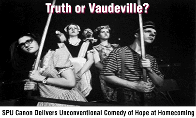 How else to explain the jugglers? A pet dinosaur? Esmarelda, the fortune-teller? The invoking of great philosophers and divine scripture? It's vaudeville meets Genesis as the Theatre Department presents Thornton Wilder's The Skin of Our Teeth January 28-30 and February 4-6. "It's a dynamite play and was quite bold for its day," says director James Chapman of the production that opened on Broadway in 1942 and starred Tallulah Bankhead. "It defies convention," notes Chapman, "yet ultimately asks the fundamental questions. What is the purpose of life? How do I fit in? What is man's relationship with God? It illustrates that the ultimate challenge of the human being is the struggle with self. That is a powerful and useful thing to say to freshmen." For that reason, students in the Winter Quarter freshman Common Curriculum course "Character and Community" will be required to read the script and attend a performance of The Skin of Our Teeth. It was chosen to be part of the course both for its noble testimony to the indestructibility of the human spirit -- and its accessibility to the broadest possible audience. George Scranton, associate professor of theatre, recommended that The Skin of Our Teeth be included in the "SPU Canon." He believes comedy is an effective vehicle for conveying biblical truth. "The comic vision contains the potential for a theology of hope. In The Skin of Our Teeth, Wilder takes us to the brink of disaster but affirms with Job (from whence the title comes) that we will narrowly escape destruction. It is a comedy of grace." Rather than a typically chronological story with a beginning, a middle and a climax, the play is accomplished through a series of major world events. And like Wilder's other Pulitzer Prize-winning play, Our Town, it is done with minimal sets and staging. The Skin of Our Teeth features George Antrobus of Excelsior, New Jersey, his wife and two children, and their maid Sabina. Together they survive a series of severe trials from the Ice Age and The Flood to locusts and the advent of the double feature. That they, like all humanity, escape repeated catastrophe "by the skin of their teeth" is a tribute to mankind's resilience and the providence of God. When it debuted, the play provided a ray of hope for a world on the brink of war. Senior Holly Venable says the production that now consumes most of her waking hours is a great study in universality. "It gets away from the grand scheme of humanity and shows us instead how world events affect one common family. It says a lot about how the world works, about the cycle of life." Venable is Sabina and in the course of the play must go from a fluttery domestic to a determined seductress - and back again. "It's a challenge to sustain just one character all the way through a full-length production," she says. Wilder is a logical choice for a large and diverse Homecoming audience because of his Christian convictions. Princeton and Yale-educated, the American playwright was a born-again believer in the tradition of Wesley and solidly trusted in a loving and just God who ordered the universe. He firmly believed that it was mankind's duty to find unity with that God. Wilder believed that life is good; humanity has value; and the small moments of life contain great significance. Sometimes it requires a humorous allegory, perhaps even a pet dinosaur named Frederick, to bring it all into sharper focus. | ||||
