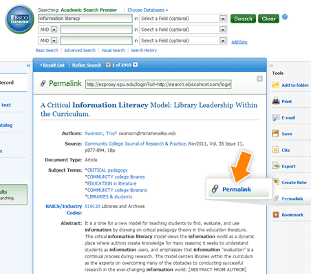 For some library resources, particularly EBSCHOhost databases, the URL that shows in the address bar of your browser is session specific and could stop working at some point in the future. When you save links, you will want to look for a way to save a stable link to the resource. In EBSCO this is called a permalink, it may also be called a stable link, a durable link or a persistent link.